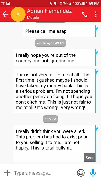 I purchased a washing machine from Adrian Hernandez (sorry I cannot find his client id). The first time I used the washer, water and soap gushed everywhere. My brother, my boyfriend and I went onto youtube to try to figure out if it was an easy fix or not, but it wasn't their field of expertise. I had contacted Adrian immediately. I was so afraid he sold me a lemon. He was nice enough to come out and fix it. He said this kind of thing is what he goes to school for. He also said it was only 2 years old and this has never happened to him. So he did, which I found him to be a straight up guy by doing so, he came by and took a look at it and said it was the water pump. Now because he was nice by coming by and trying to make it right, I didn't even ask him to pay for the parts. I just did it. It cost me $70 for a new pump. I wasn't home when it came in but my mom let him in and he did install it for me. I was so happy to come home and do laundry. Now this is after 4 full washing machines of water and soap have gushed out onto my floors. Thank God its a patio laundry room. I had the dryer up on 4 gallons of paint cans to keep the water from getting the dryer wet and breaking too. But the washing machine wasn't fine. It gushed water everywhere again. Adrian once again came over to take a look to see what was the problem. He fixed it once again and what I thought was the last time. All seemed to be working well. I washed blankets just to do wash to make sure it didn't leak anymore. I am a flight attendant. I am gone for weeks at a time. I do not use this washing machine everyday. But 3 nights ago I saw water gushing out from under the washing machine once again. I spend $360 on the both, the washer and dryer. And an additional $70 on a part for a bum machine. Ive contacted him for the last 3 days and nights and he hasn't replied to me at all. I honestly thought he was a nice person. Unfortunately I deleted the texts between him and I about the machine. I had videos and pix and our text thread that was for quite some time as our schedules seemed to collide. I am going to go on youtube to see how to get those old texts back. I do have texts and a video that I sent him these last 3 days. He hasn't gotten back to me at all. I really didn't think he would do something like this. I told him I wish I just returned both items and gotten my money back the first time this machine gushed soapy water everywhere. I haven't heard back so Im reaching out to you. I want my money back. He can have his washer/dryer back. Its been nothing but problem after problem. Its not fair to me at all. It has been nothing but a headache and more stress that I do not need in my life.