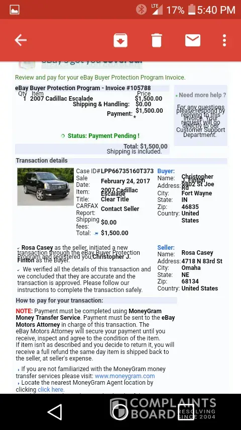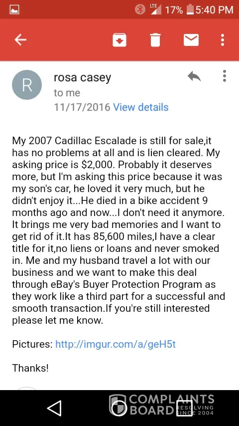 I contacted Mrs. Casey in order to purchase an suv that she had for sale on your site. She sent me information on how she would like payment and directions on how the transaction would work. She said that she was working with the ebay vehicle protection program. That we needed to send the money via money gram to the ebay attorney. The attorney would hold the money until we received the suv and if we decided to keep it then the money would be released to her. We sent the money on Saturday and were told that in no longer than 24 hrs. That shipping would begin. We have not heard from ebay or her since we sent the money. We have called ebay and they said they do not work with monogram. So we no longer have our money and no suv.
