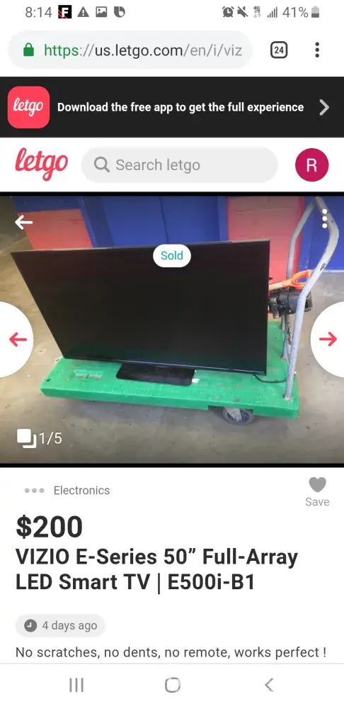 The TV was purchased on July 1st. It was advertised as being perfect condition. It was tested at my home. It worked when turned on however it continues to go to a black screen with no sound. I have texted the seller. In addition, I sent him a complaint via the LetGo portal however the seller has not returned communications. I now believe this sale was fraudulent. I hope that LetGo will address this matter with a full refund and restrict this seller from conducting business on LetGo and ruining the LetGo reputation. Also I am informing my Bank of America of the fraudulent transaction. You are aware that Bank of America takes these fraudulent transactions very seriously. Please get back to me as soon as possible.