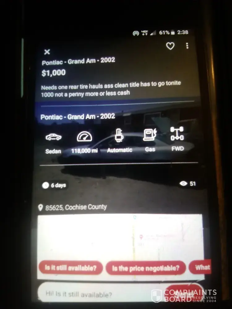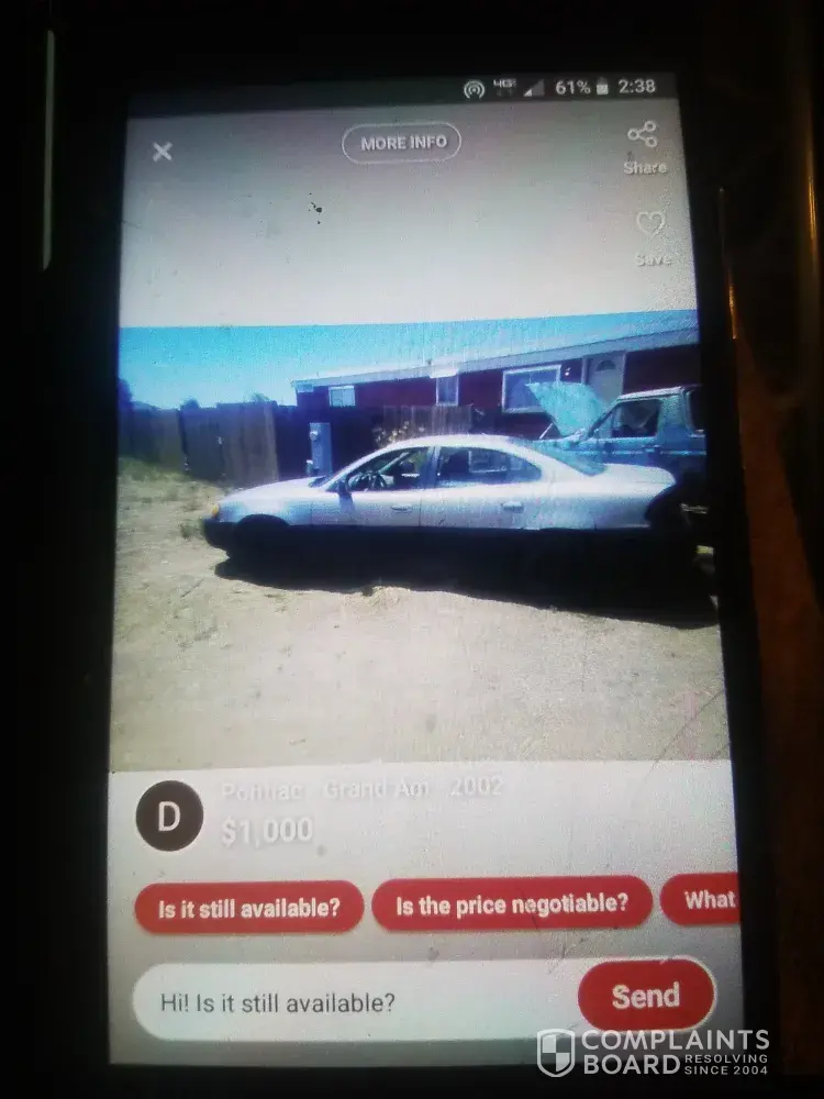 I just seen a listening that is not supposed to be on letgo of a car that is owned by my husband the person selling the car does not have permission to sell the car and the name on the title is not there's it has my husband's name on it. The listings need two be taking down asp. It is a scam and hey are trying two self a car that is not there's. Here are pics of the listing of the car. This person is trying two self a car that dos not belong two them.