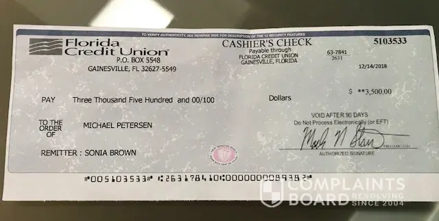 I recently posted some speakers (end of November/ beginning of December) to sell on Letgo. I was contacted by an interested buyer, we agreed on a price of $500 and he wanted to send me the $ via a check in the mail. So I gave him my address and when I got the check, which arrived yesterday 12/19/18, he had sent me $3, 500 and wanted me to use the overpayment of $3000 to pay someone who was coming to pick up the speakers. This seemed suspicious so I asked him to verify details and he wouldn't give them to me. I went to the Letgo app to report this scam but his profile has disappeared. The Phone# he was using was [protected] and [protected]. The signature on the cashier's check appears to be Mark N Stan and printed on the check states, "Remitter: Sonia Brown". The check is from (as printed) Florida Credit Union PO Box 5548 in Gainesville FL, [protected]. Check # 5103533, dated 12/14/18, with routing number on the bottom of the check: [protected] - [protected] . The address on the envelope is "FROM: Air & Water, Inc. 6600 Katella Ave. Cypress, CA 90630" (see photo attached).
