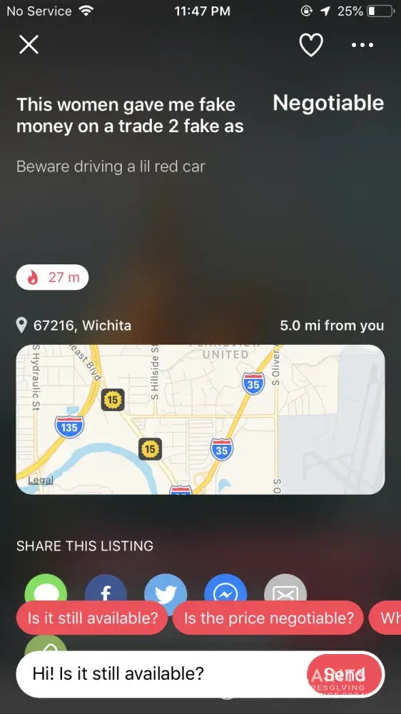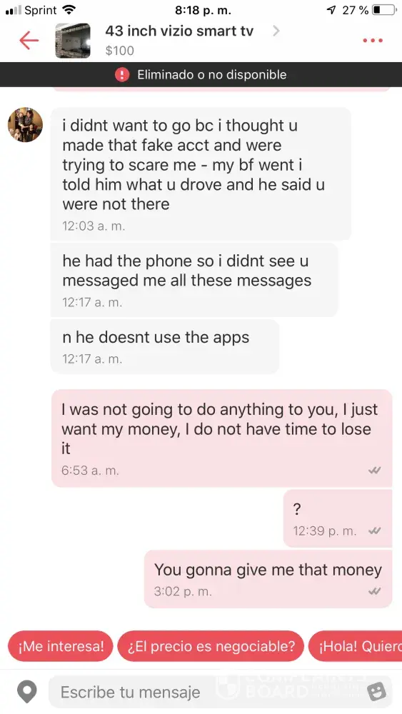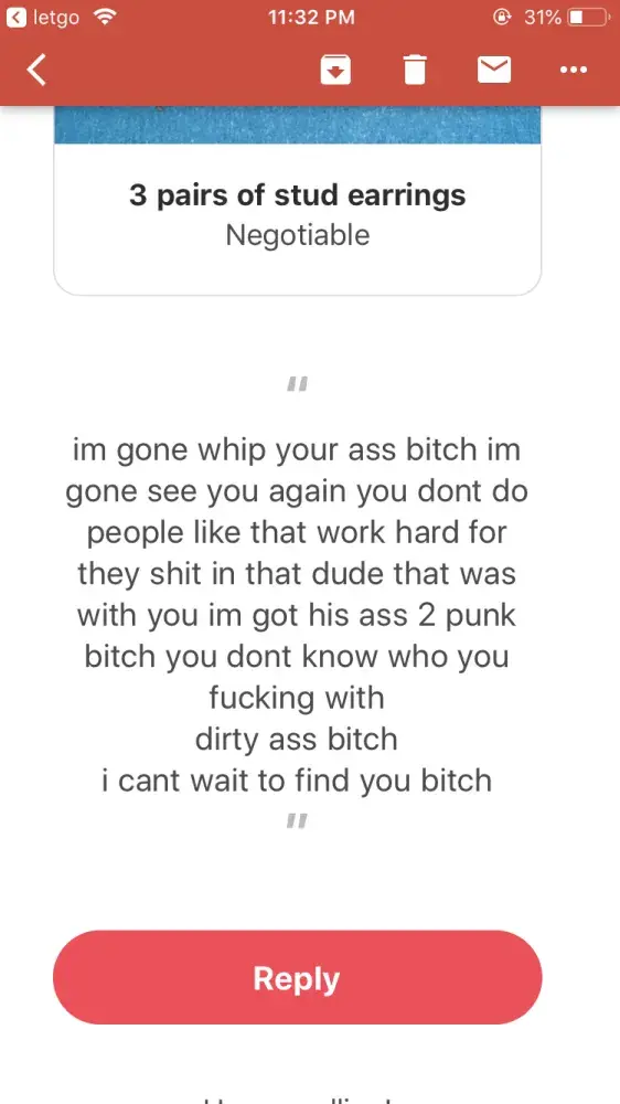 I had set up a deal with a woman named "Shawntell Truss" and after I got home and continued to try to get the item I bought to work, I realized that she had sold me a financed, unusable item. I went to question her to figure out if she knew the item was in that state but upon sending her a message she had messaged me saying that I paid her with counterfeit money. I offered to take it back and she could have her faulty item back but she continued sending rude vulgar messages to me like I had not replied at all. She then threatened me and posted a bunch of pictures of my letgo profile on letgo saying that I paid with fake cash . I know the cash I gave her was real since I got it out of the atm from the same gas station we met at directly before she arrived. I would like for her to be banned for unnecessary acts and threats she's done. But if that can't happen I would at least like for her posts of me to be removed. Much appreciated