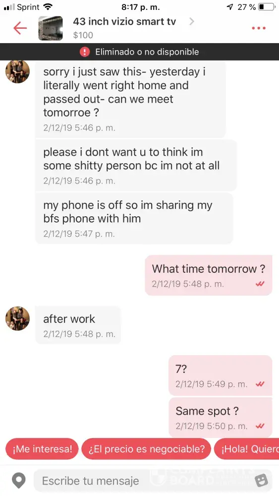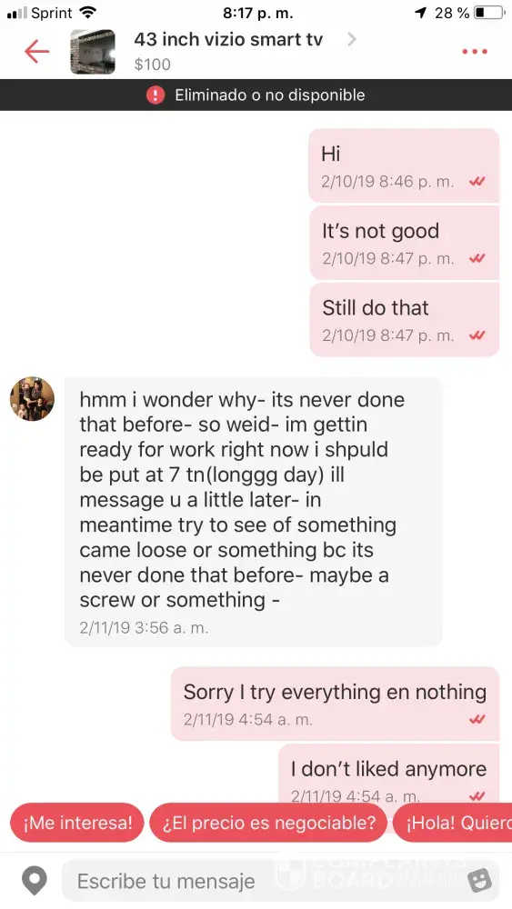 I bought a 43 inch tv from Danielle for 80$ On 2/10/19, we met up at an aldi in Patchogue NY and we tested the tv in my car to make sure that the tv wasn't working. Turned it on and it was acting a little funny so Danielle agreed to letting me take the tv home and see if it's still acting like that at home. If it was still acting up she would take the tv back and return my money, we went home to test it and it was even wrose (I have a video to prove it) I contacted Danielle through letgo and I wrote to her for 2 days and never got an answer from her. Eventually she wrote back stating that a lot was going on and that she didn't have a phone so she was using her phone. I told her I understand let's meet up yesterday which was 2/13/19 at 7pm at the same location. She agreed to meeting up and I waited for an hour in a half. I contacted her and advised her that I will be reporting her for false advertisement. She then blocked me off of letgo, I would like someone to return my money if it's her or someone from letgo