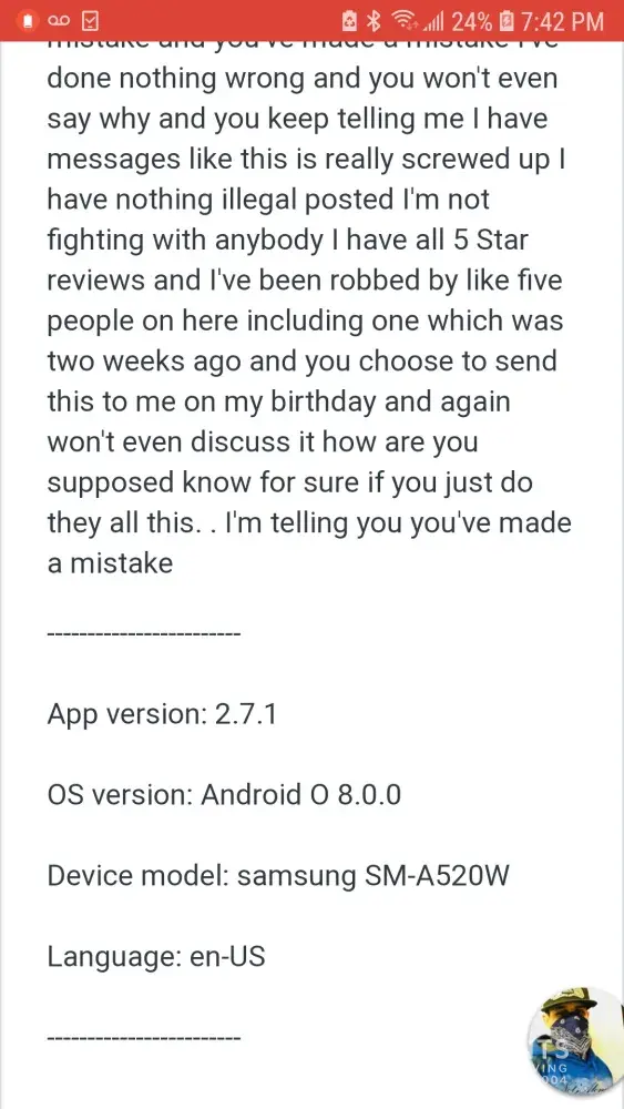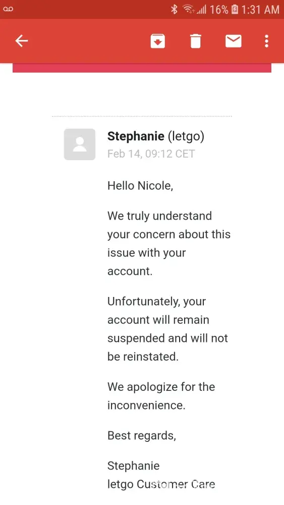 Hello I am having an issue with the letgo app and I have read online that this is kind of a common thing for people but nowhere does it have a way to resolve it. I have emailed asking why this is happened no one confronted me about anyting or thought to look into it. On my birthday February 13th I was suspended indefinitely from letgo. And they will not tell me why they just ignored or send me a copy of reasons why it might have been deleted. But I did not have any weapons posted I was not arguing or fighting with anyone I had over 90 five star reviews in the last year-and-a-half nothing that was posted was racist or offencive. And I have asked repeatedly the reason why and they will not reply even when i called I asked to speak to a supervisor and I didn't get one. And I'm honestly just flabbergasted at this point that's a lot of work down the drain to take the pictures post everything with the details and titles and descriptions prices and such for nothing.. Steven says if you think that this has been flagged as a mistake contact us here and I did that and they did not reply but I got to questionnaires about what I think of her customer service a week later.. and the only notice I am getting is it is suspended for review which implies it's pending not indefinite but a lady named Stephanie wrote me saying it was not going to be reactivated again again she didn't even say why she just said sorry for the inconvenience. Yet I'm still getting notifications. Something I was looking at has been sold or I have messages waiting for replies? . How do I get them to speak to me about it and possibly resolve the issue if there even is one ?