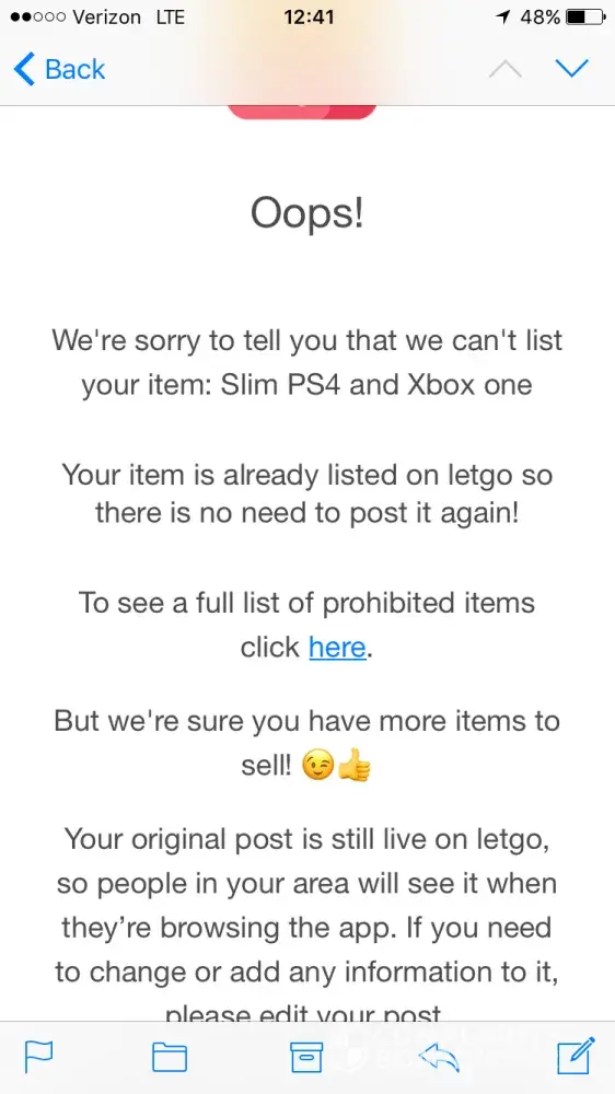 I do not have this listing in letgo. It's keeps discarding the listing stating that I have it listed twice. If you look at my account you will see that I do not have the posting at all. Please fix this. This is the 3rd time it has happened to me.