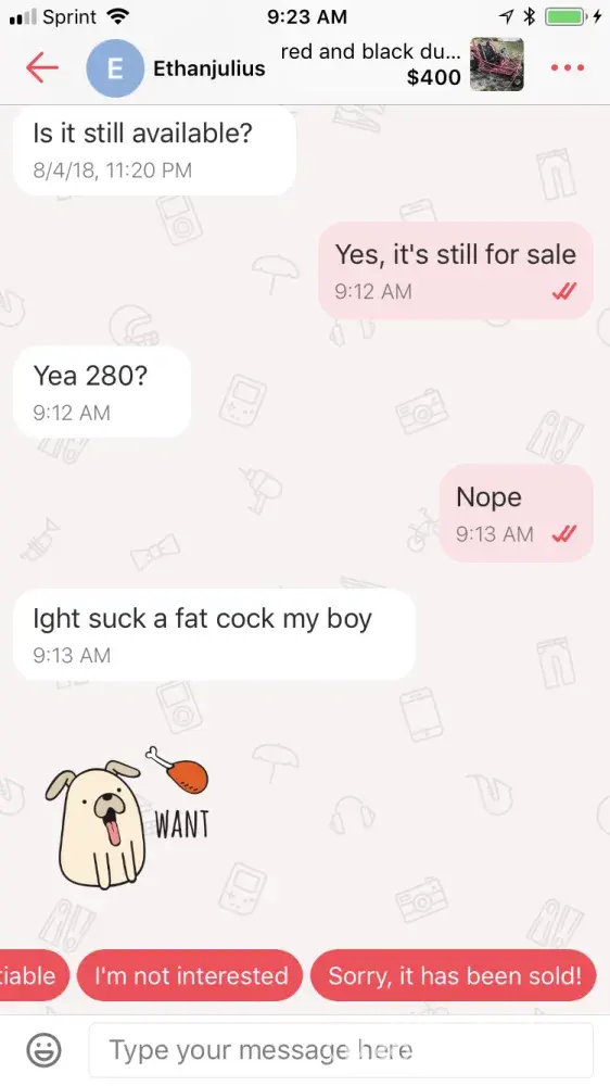 A gentleman was inquiring on an item I am selling and because I wouldn't give it to him for the price he wanted...he sent a negative sexual comment back. I am a female and will not accept this at all. Please do something about this negative person.