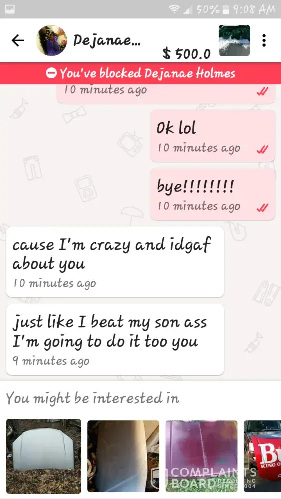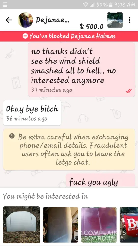 I wasn't interested in a car any long because I noticed the wind shield smashed and she got defensive and threatened to kill my family I am afraid for our safety. I just thought that saying I wasn't interested she would move on.. there is a police report as well because I frlear for her child safety too