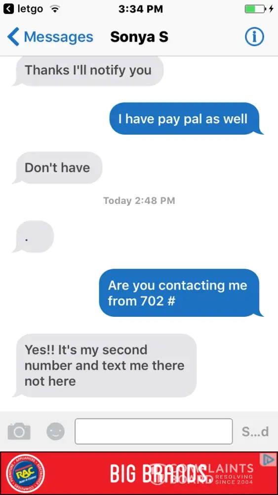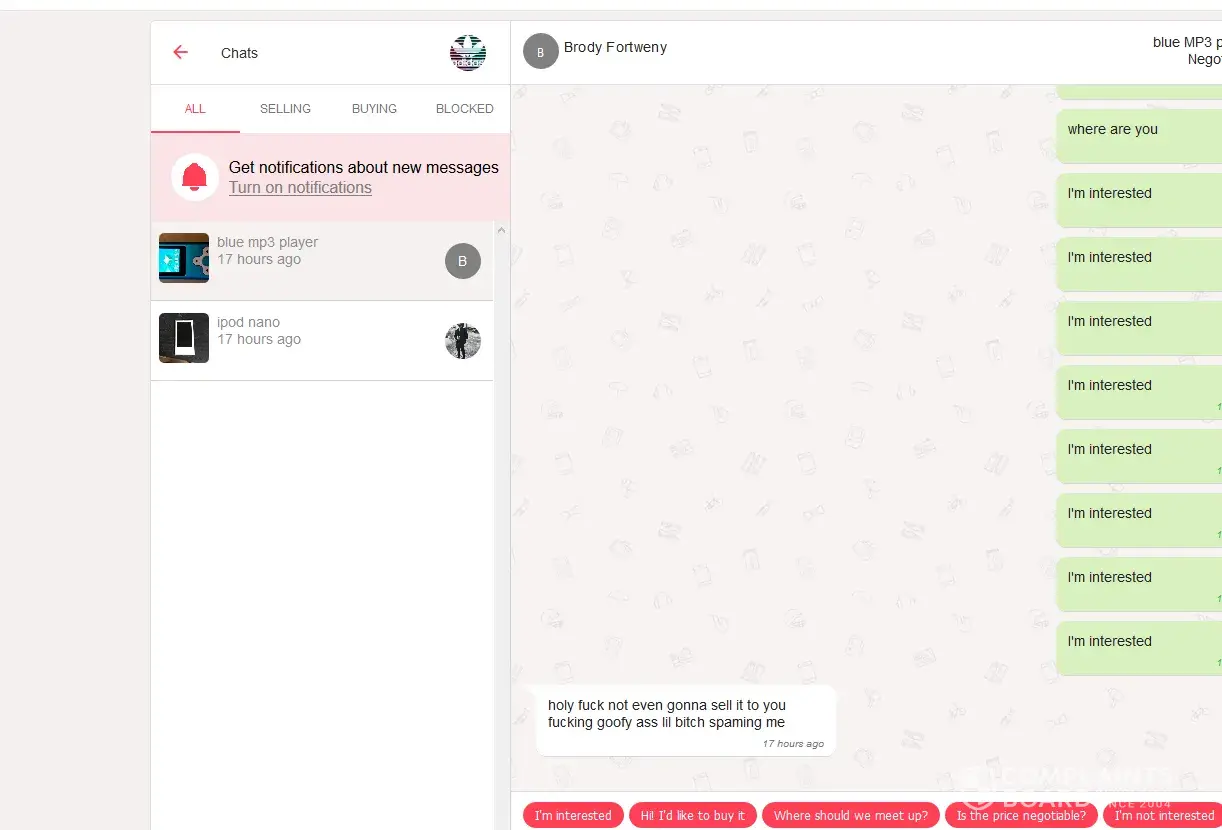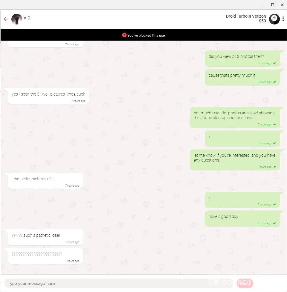 Ever heard of a "pocket dial" or text? Ever start to nod off with your phone in your hand while in an app, waking up to realize you had touched the screen accidentally, one or many times, in a conversation or not? Looks like you're using the desktop/computer version of Letgo, but have you ever had a smart phone with a touchscreen so cracked that it began to have a mind of it's own, making "ghost-touches" very rapidly and randomly without any way to control the chaotic activity except to hold the power off button until it shuts down? Can imagine several scenarios where a person might accidentally send one-touch Letgo template messages/responses repeatedly, and in excess, like seen in your situation. I highly doubt it was done deliberately. Don't sweat it man, and maybe think the situation through, even briefly, before interpreting it as something it's likely not, and then becoming personally offended by it and blowing the incident out of proportion to the point where you are becoming emotionally effected and then wasting your own and other people's time/energy by broadcasting your insignificant non-issue to the entire world on a public forum meant for resolution of serious and worthwhile complaints and grievances, often with significant financial loss and impact on their entire families.