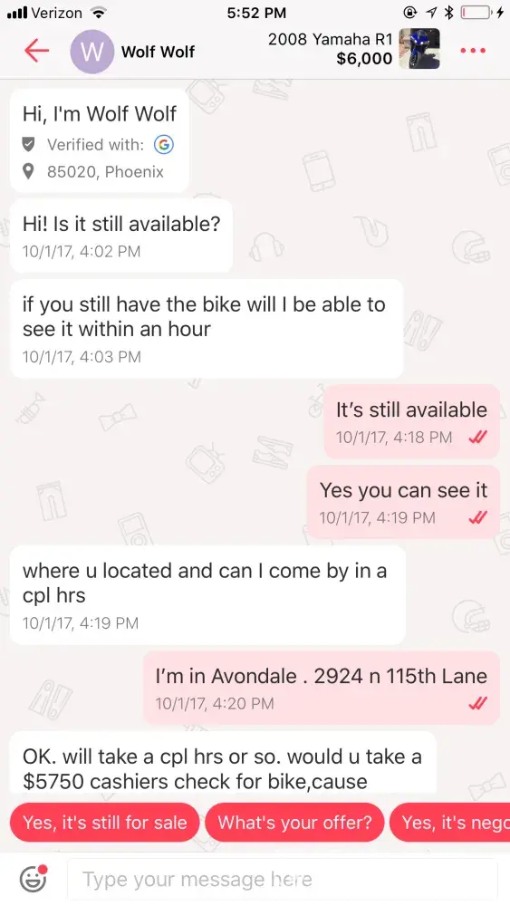 My motorcycle was stolen by a user from your site call wolf wolf out of Phoenix Arizona on October 3 2017 we went for a test ride and never returned. I need your help to locate this guy please. My name is Ryan jenkins and my number is9285502805