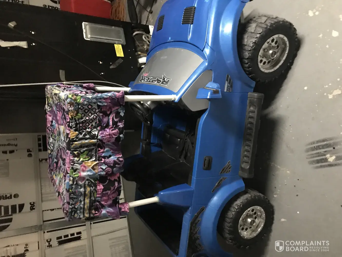 for a power wheel play car ride along keeps getting thrown off? I keep looking for it and it disappears I've posted it two times now it's $40 it's a power wheel raptor truck. I see my singer sewing machine but not the truck. Please respond to why he keeps getting thrown off?