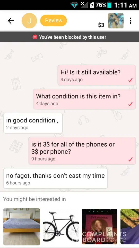 I have put one bed for sale on here, been contacted by 3 fake people and nothing else? They send me a message asking if it's still available, I reply "yes it is" and never hear another word from any of them. I have no option to report the accounts as fake and it's annoying as hell.