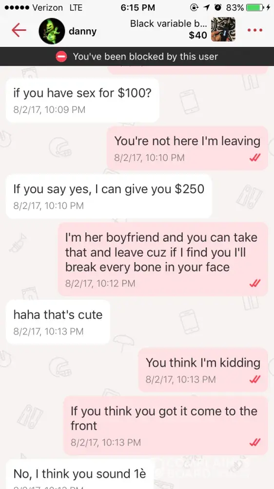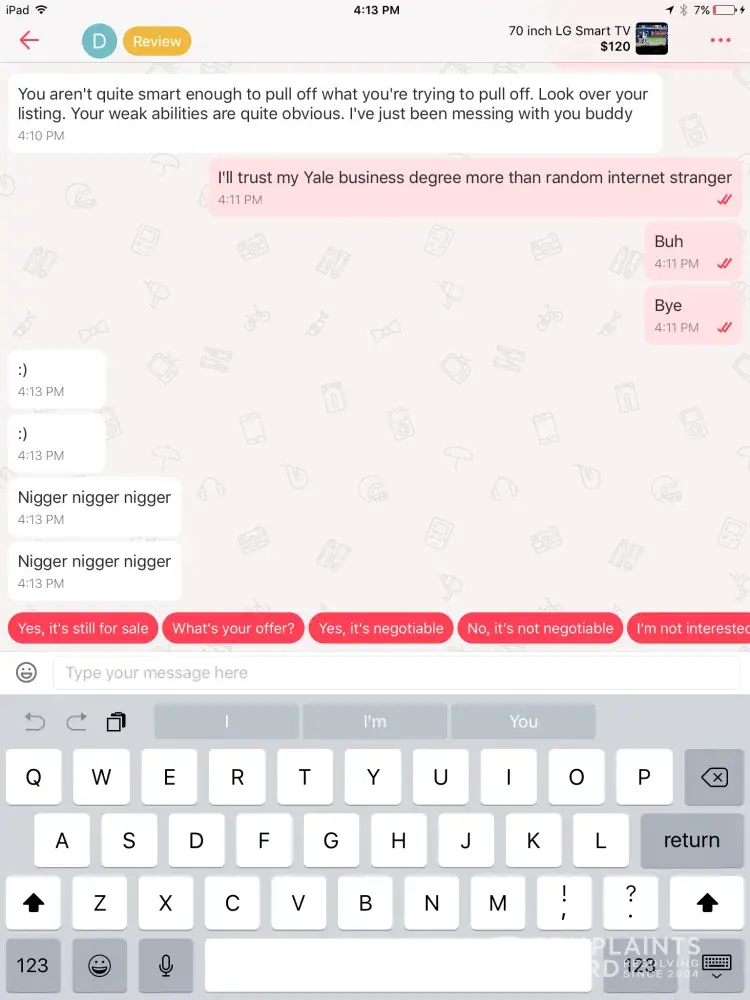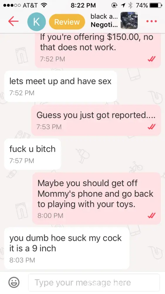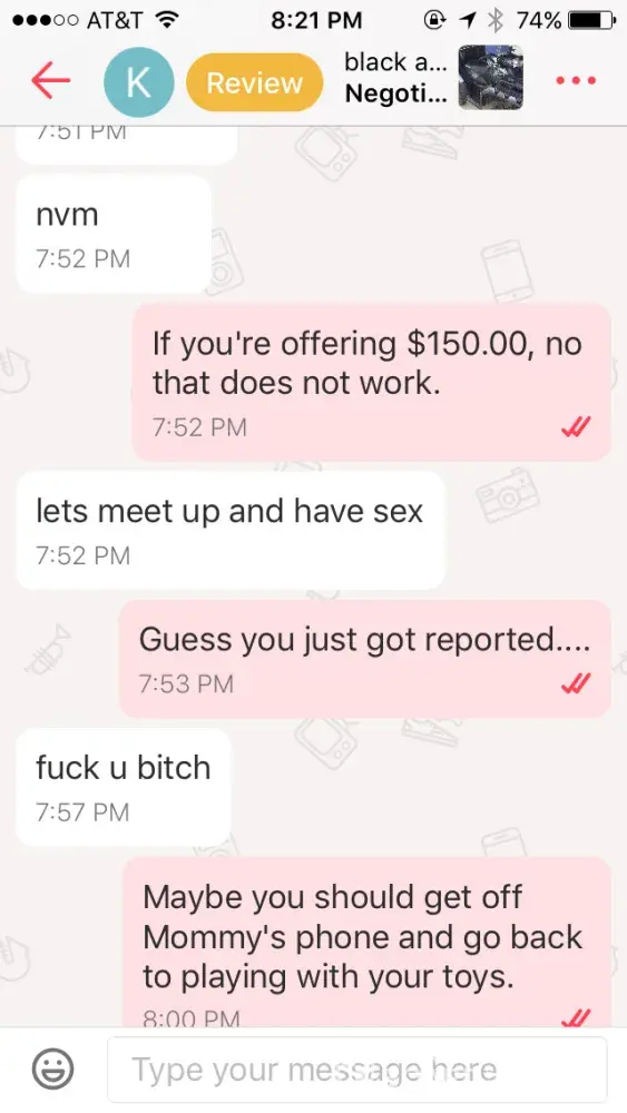 So I have a product for sale on letgo an the buyer sounded interested in buying it. He told me he could come get it and I said I'm not home my mom could sell it to him, after I gave him my address, he said he wasn't interested an I asked why and the person told me to [censored] I'd like for this to be handled an a IP address pulled from the user.