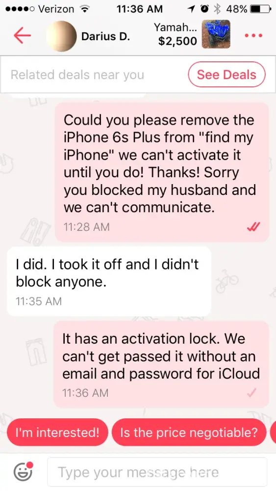 Purchased an iPhone 6S Plus from user Darius D from Talladega, Alabama. He erased the phone, but did not remove the Activation Lock and refuses to do so. He blocked us within 1 hour of purchase on Letgo so we can't even leave a review. We are out $250.00. We have no options.