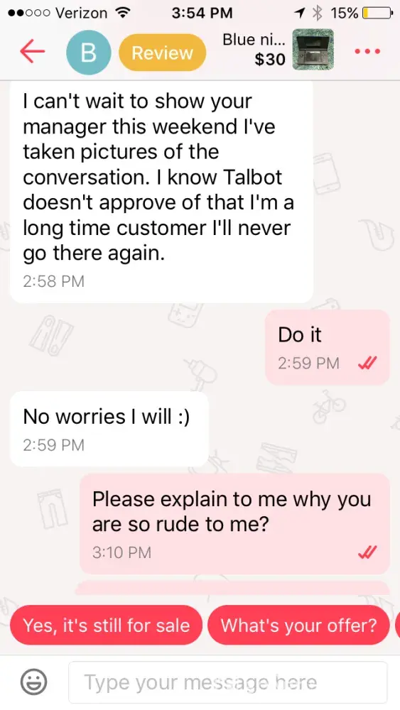 a kid insults a dead family member of mine after i asked "how much would you take?" (it said negotiable). then he reviews me badly, and blocks me so i cant review him. how the hell is that fair, letgo staff? its not. im gonna go to the BBB if this isnt cleared up fast.