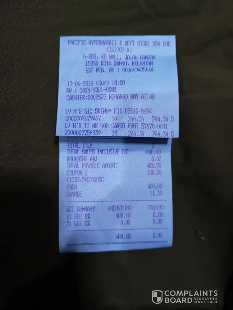 I brought 2 pants and a shirt Around 8:30 PM of 20th of June, 2018, from Levis factory outlet, at gulistan e johar, adjacent to Chase up store, Karachi. Receipt attached.