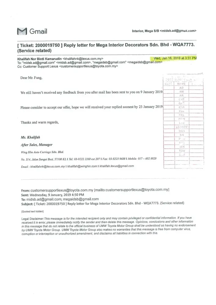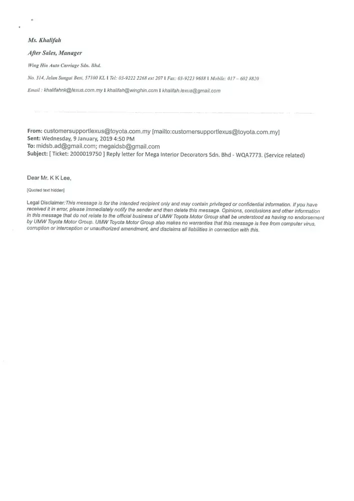We are now totally lost confidence with your prestigious brand name LEXUS vehicle. Once again we sincerely wish our clarification and issued highlighted to your organization(Japan) with enclosed of our letters and your dealer's letter as stated below:
