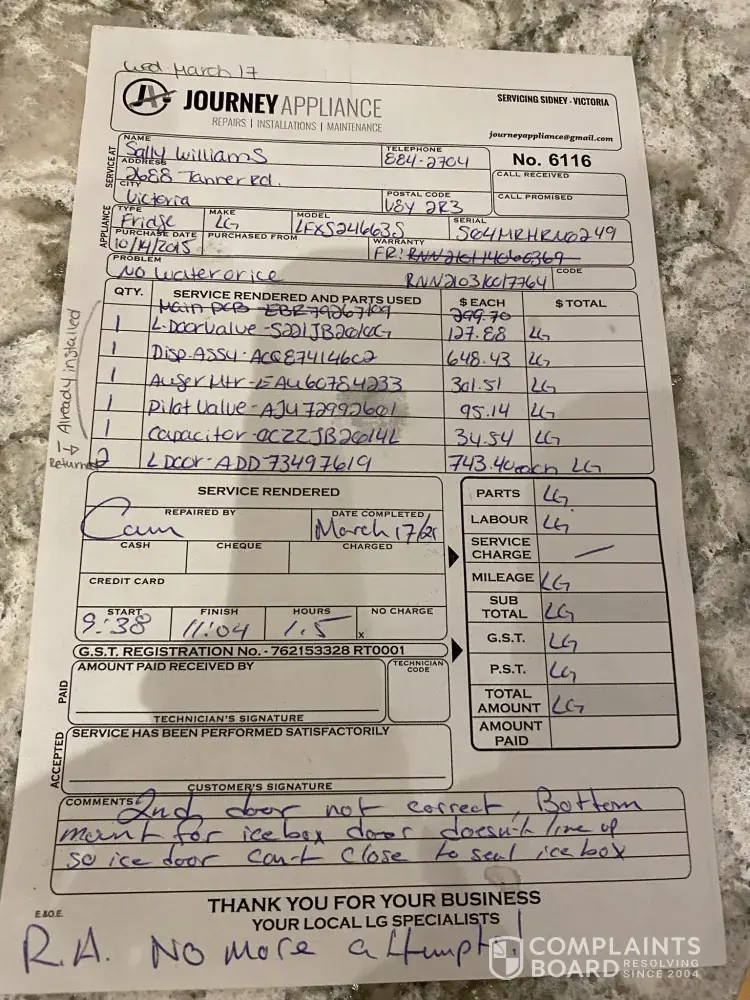 Hi I had a replacement compressor which was under warranty and replaced with no problem by Cam at Journey Appliance in Victoria BC. In January we called Journey as our water/ice dispenser stopped working. We paid extra for the LG flat rate option and a replacement door was sent. The door was sealed with insulation so water could not flow to the dispenser. Another door was sent in March and it didn't fit. By this time Journey were frustrated to say the least, and justifiably so, as they were having to pay upfront for all replacement items and call out charges. I have contacted LG numerous times with promises and apologies but so far we have not moved forward. I sent an email to LG recently, as I thought it wise to try a variety of methods to communicate, with promises to reply as soon as possible. It is over 6 weeks and I still haven't heard back. I will be happy to supply you with further information including call out notes from Journey to substantiate the information I've supplied. My email [protected]@icloud.com [protected])