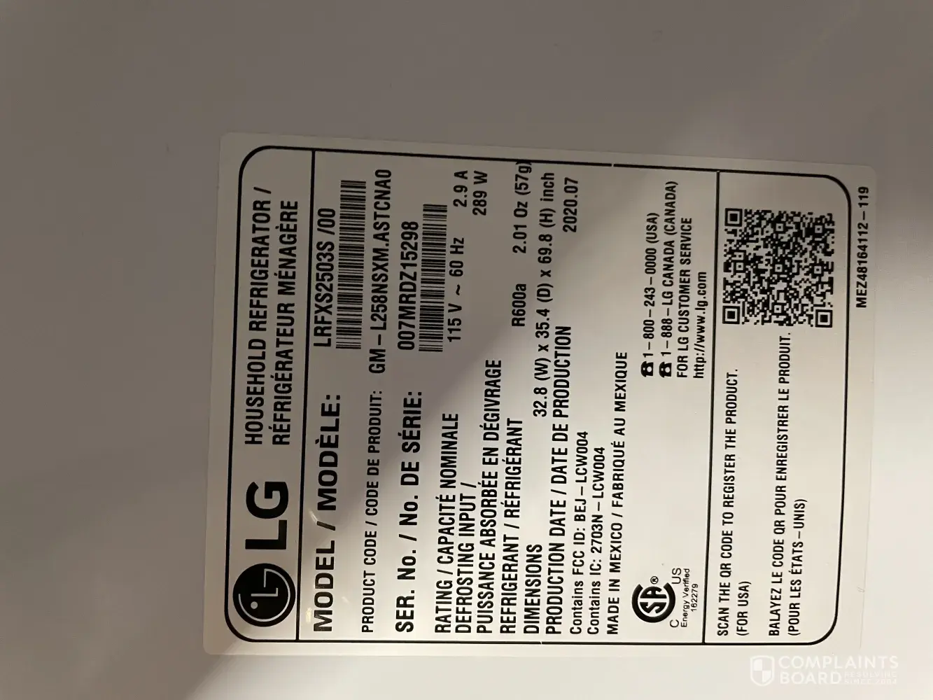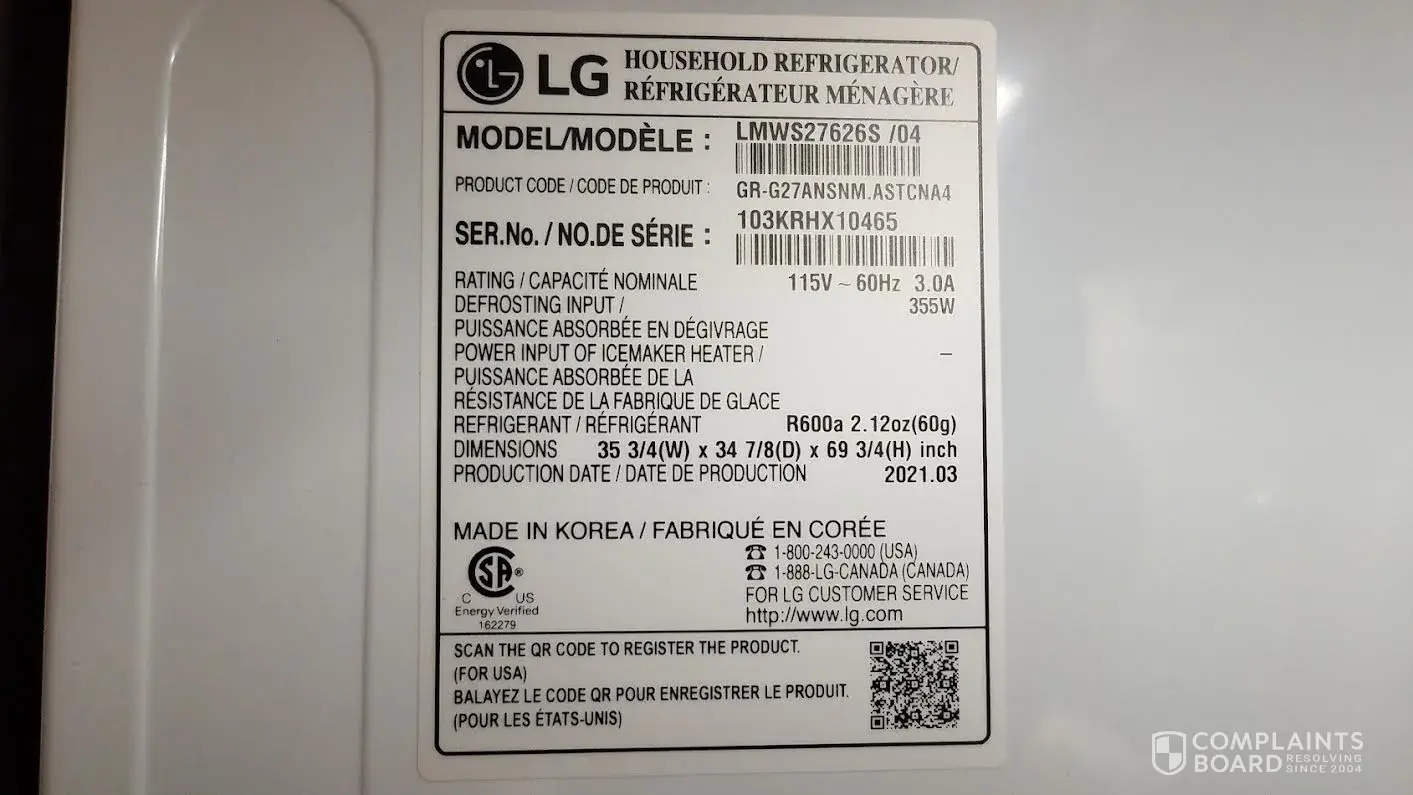 Model: LRFXS2503S from Best Buy. I paid $3000.00 and only got 13 months use out of it. Every appliance service company here in my hometown refuse to service LG (I understand why). Originally I wanted a simple repair, then replacement, now I'm seeking a refund due to delayed repairs.