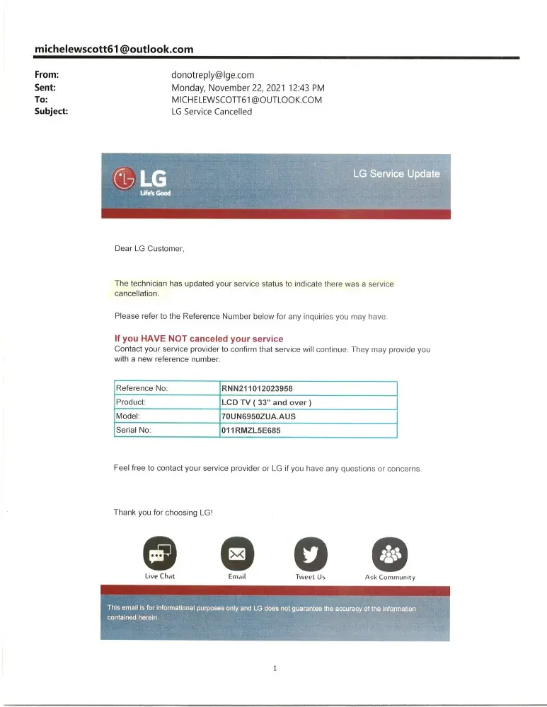 - Technician said "I don't know what's wrong, call LG"