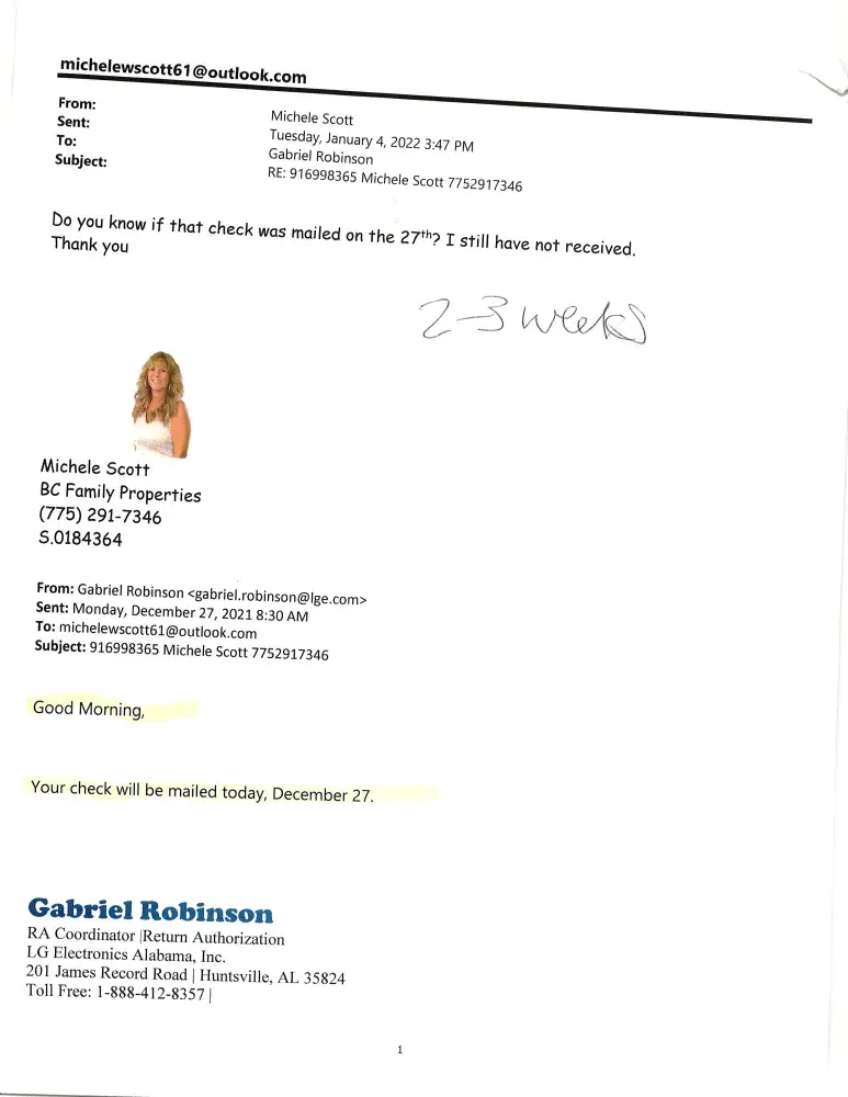 Desired outcome: Get the check cover so I can finish my business with LG Electronics and never buy another product from you