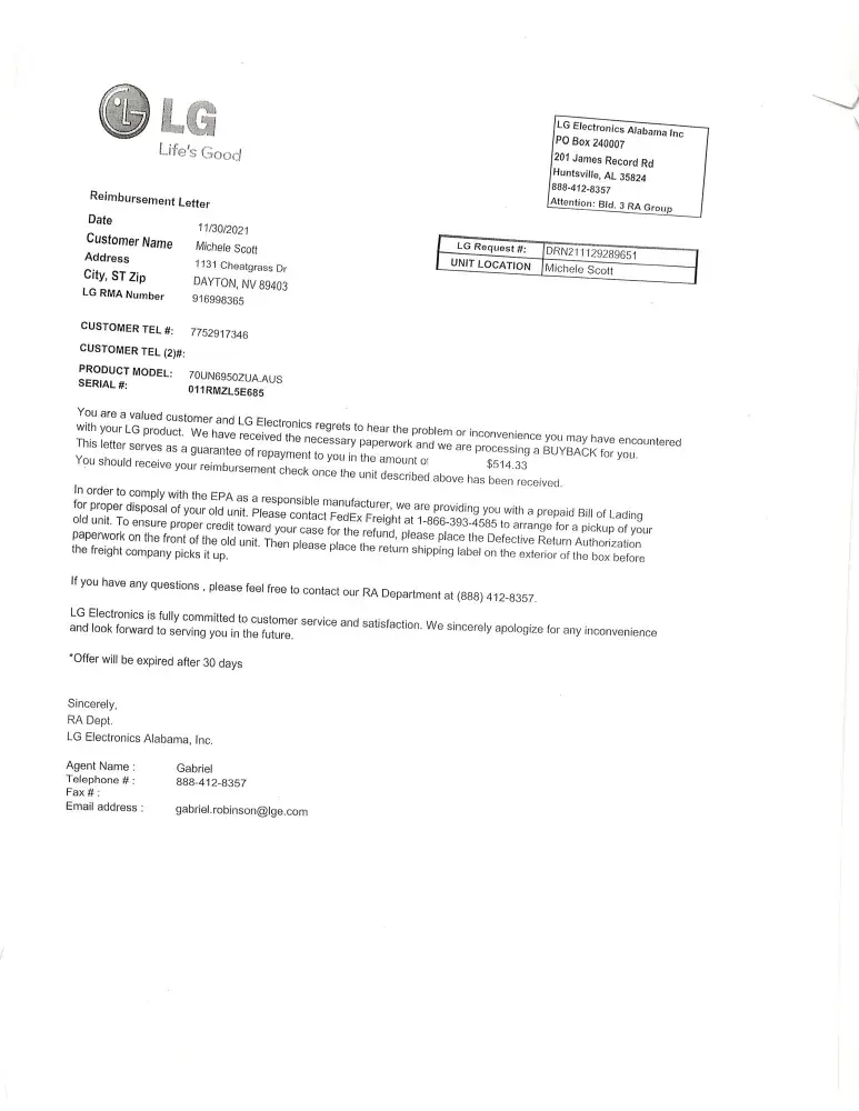 After the Blue Line down my 70" TV could not be repaired and still under warranty I was sent a shipping label, but not provided with a box ! The returns department received my TV the 20th of December 2021. First I was told my check went in the mail the 27th of December. The next time I called it was mailed the 31st of December. Today is the 23rd of January and I still have not received my check. I wonder are they really going to send my check? Also, this whole process started in October ! Every time I called to inquire about my repair customer service treated me very rude. At one point I was told the service ticket was cancelled ! I wrote a letter to Cho Jun- Ho. Never heard from him. One would think a company the size of LG would have better procedures.