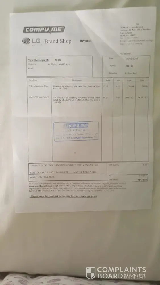 Kindly note that i bought a washing machine from compu me "mall of arabia" branch in egypt, on 06/06/2018, i was supposed to receive a gift on the same delivery day for the washing machine, but they claimed that the gift is currently out of stock and still; considering that other shops having the same advertising campaign for lg had that gift "hanger for washed clothes", till now each time my father goes there asking for the gift they keep on telling him that it is still out of stock "it is almost more than one month", from their behavior i believe they don't even have the intention to give me the gift need your proper action in this regard as i'm really upset as i'm one of lg loyal customer. My number [protected] my name is may currently staying in kuwait. My father's number in egypt is [protected] Maher wahba.