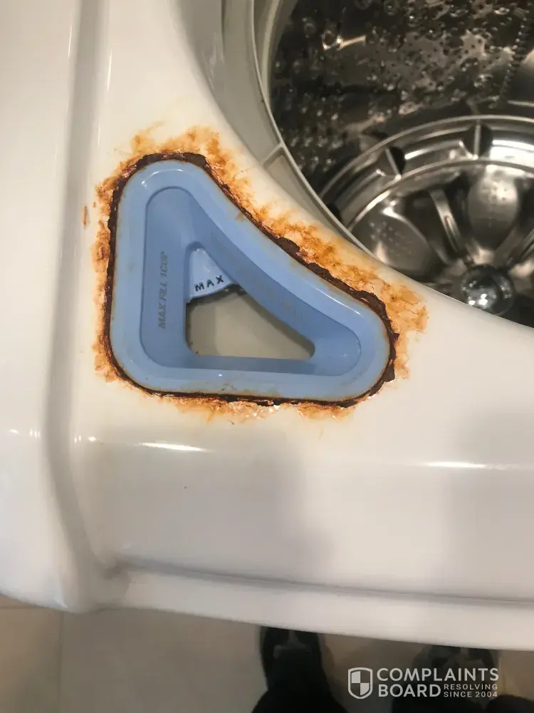 I bought this washing machine and dryer new from home depot on August 2012. I also purchased a 5 year extended warranty on both items. I had repair men out several times for both appliances. The washing machine started to rust within 1 year but I was informed that rust isn't covered by the warranty. The rust has gotten so bad that I am faced at buying a new machine because it has transferred to my clothes during the washing process. This is unacceptable. I would the part replaced free of charge including installation. I do not believe this is an unreasonable request. A washing machine should be able to take water without rusting! It has been in the same location, a well vented laundry room since purchase.