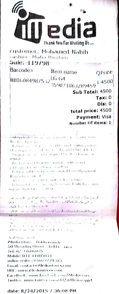 I bought LG-G4 (LG-H815P) on [protected] from iMedia store in Cairo, Egypt. My G4 had a bootloop on 4-4-2016, I called the customer service for LG in Egypt, they refused to replace the phone (which is still in the 1 year warranty), they only offered to replace some hardware internal components, at the end I agreed, then I emailed them the receipt I have alongside with the warranty certificate and the S/N of the phone, they confirmed that these are the only required documents and they told me that the only available place for replacing the hardware components is outside Cairo, almost 50 Km outside Cairo. I went there during their working hours, I took almost 4 hours to reach there (keeping in mind that I have just had an ACL surgery in my knee and I can't move easily) and then they told me that the receipt I have is not acceptable and I need another receipt! the receipt is the same one I emailed them and they confirmed it is correct! I even told them to take the phone and fix it and I will get them the other receipt they want when I come back to take the phone but they also refused!