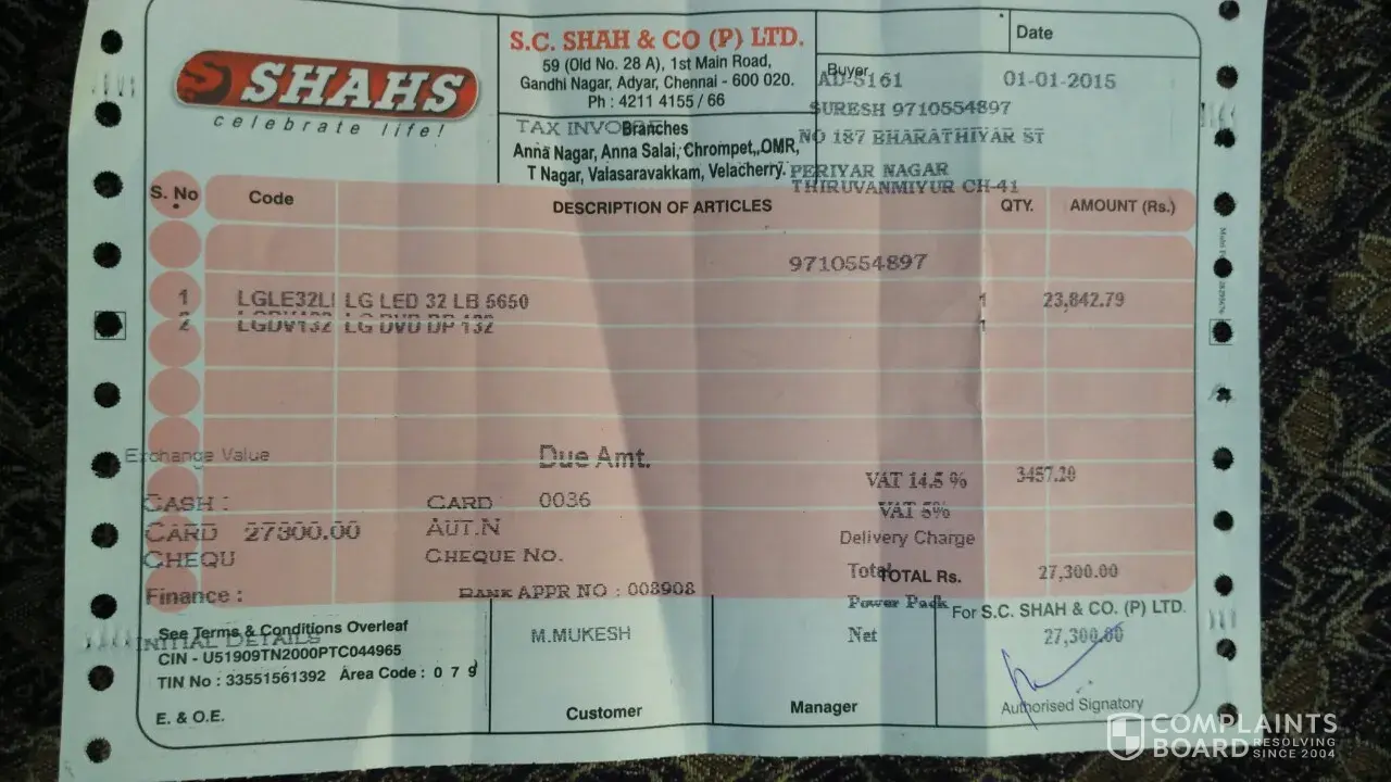 I bought a 32†LG HD LED TV from SHAHS ADYAR- in Gandhi nagar, Adyar, Chennai-20. On 15th January 2015 of about 27, 000. On 28th feb 2016 (on month after warranty completion ), while we were watching the program in TV around 10.00 AM, suddenly 4 inch diameter size in the center of display become very bright and become white colour.
