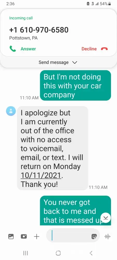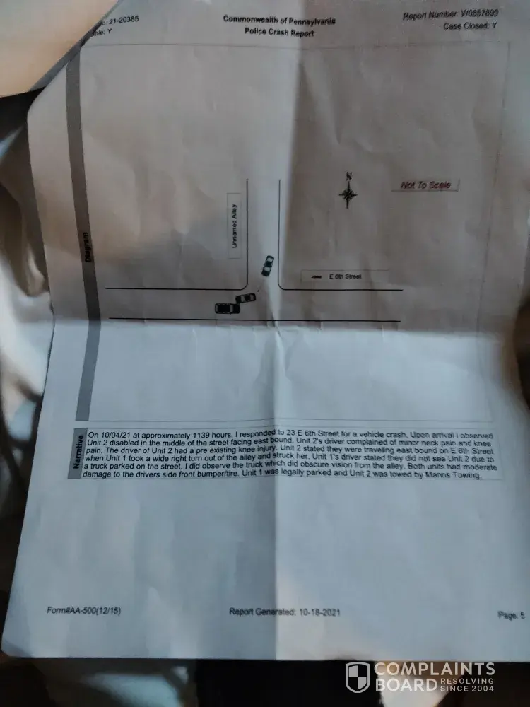 I was hit on October 4th bye a driver that also has your car insurance company. The guy wrecked my car, the police report clearly states that he is at fault. Because I didn't have Collision on my policy, no one is doing anything on my behalf. They have another claim open they made on my behalf, but until they get a hold of this person and get a statement I am left in the dark. I have spent a lot of money on a rental car that is coming out of my pocket. Although I will get reimbursed that's if the claim doesn't get denied because of the failure to get ahold of this person. The person who hit me was not a listed driver under the policy. I received a call this morning from the driver's girlfriend stating they are not going to claim liability oh, they are not going to comply with your company. My adjuster that was on my claim has not handled this at all. I have never once spoken to this man. His name is Randy. All he has done has texted me and told me that now I have to talk to a different claims adjuster. The claims adjuster that he forwarded to me is on the other side. Her name is Chrisma Garcia. I have not gotten any answers from either side except for they can't do anything until they get the statement from the person who hit me. And as I stated earlier, they told me themselves that they are not going to do anything about this auto claim. I have been bounced back and forth between voicemails, my claims adjuster Randy has not once called me back. I'm getting tossed around back and forth between people in your company. And the only answer I'm getting is that your company can't do anything for me. I am not getting any rentals coverage, it is coming out of my pocket. I want to write a formal complaint against Randy and Chris Ma. I have screenshots of all my phone calls that I have made all of the texts that I have sent I have everything this cannot go unnoticed. What has happened to me is completely unethical, immoral and wrong. Something needs to be done about this because I'm at the point of getting legal representation to sue your company for failure to act on my behalf
