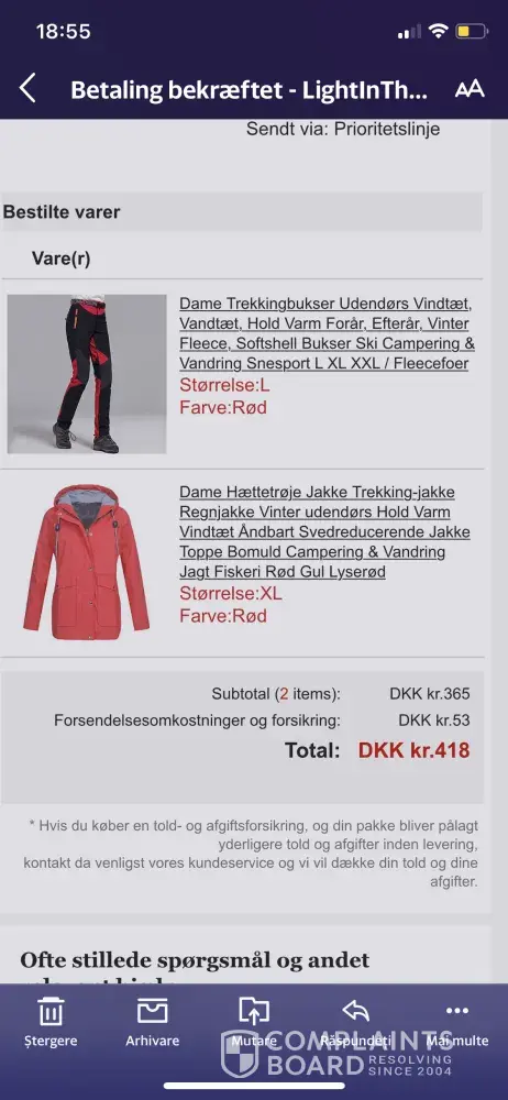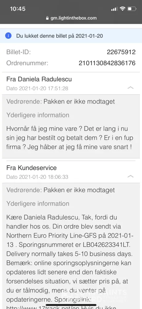 I have ordered 2 rain jackets and 1 pear of shorts from LightInTheBox company online, on the internet from 14-15 the of January and have no products or answer until now from them, I have spent 642 danish kroner which I can't prove! I just want my money back! 😡 It is frustrating because I got this shopping site from Google and I thought that is a secure place to buy, it's actually unbelievable because every time when I've tried to track my stuff they are closing the page, I can not contact them at all! So I hope I can get some help after this message! At least LightInTheBox to write me and say what is wrong! Underneath I have attached some pictures with my order!