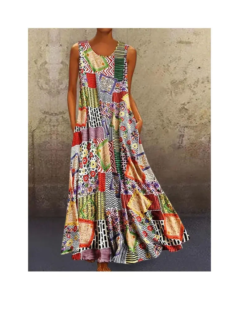 Women's a line dress maxi long dress khaki sleeveless tribal geometic color block summer round neck hot casual mumu 2021 #8030373