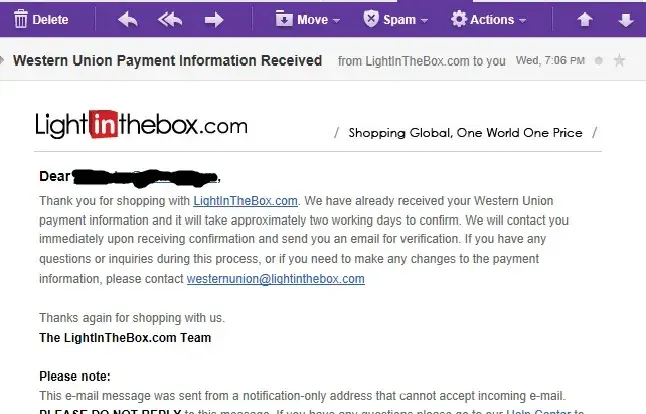 I made a purchase last week, I paid via PayPal, suddenly next day I received an email from: [protected]@system.lightinthebox.com telling me I had a message on my account on Lightinthebox.com, the message said they needed a picture of mi credit card and id card to ensure that I was the owner of my credit card, to this I replied that I did not understood why did they needed this information if I had paid thru PayPal?, even more now that I think about it how did you knew I used a credit card? It could have been a checking account ... to this they respond with a new message this time in French, I do not speak French so I had to translate it via Google and even though I’m sure the translation is not perfect what I got from it was that mi PayPal account could not be verified. So I talked to PayPal, they asked me NOT TO SHARE ANY INFORMATION ABOUT MY CREDITCAR AS IT COUD BE SOME KIND OF FRAUD. I tried reaching them thru their mail, their chat and their stupid 24 hour service tiocket sistem, non of theme worked, the lady at the chat didnt know what she was talking about and then she just let me there and went away, their mail they just didnt respond and of course the 24 hour sistem hasn´t return my message. On paypal i see the money went thru, so why dont they just send my items? why do they need a picture of my credit card? does anyone else finds this a little suspicious?