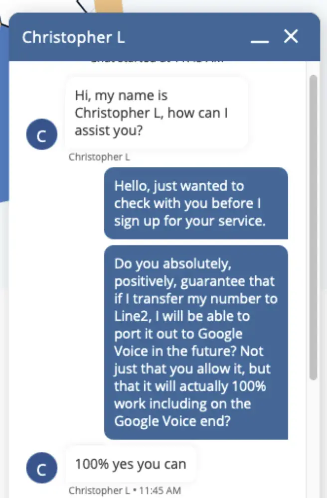 When we signed up in January 2020, they promised me in a pre-sales on the phone that if we didn't like the service, we could port our number to Google Voice. That's apparently not the case, and I'm not the only person who has been mislead: https://support.google.com/voice/thread/9576104?hl=e Google Voice doesn't support porting from Line2. So if you port you number to Line2, you have to port it back to a mobile carrier, then over to Google Voice. For those living abroad, that's not really a safe thing to rely on. March 4th 2021: they still claim porting to Google Voice is 100% possible, even when asked point blank if it would work on the Google Voice end.