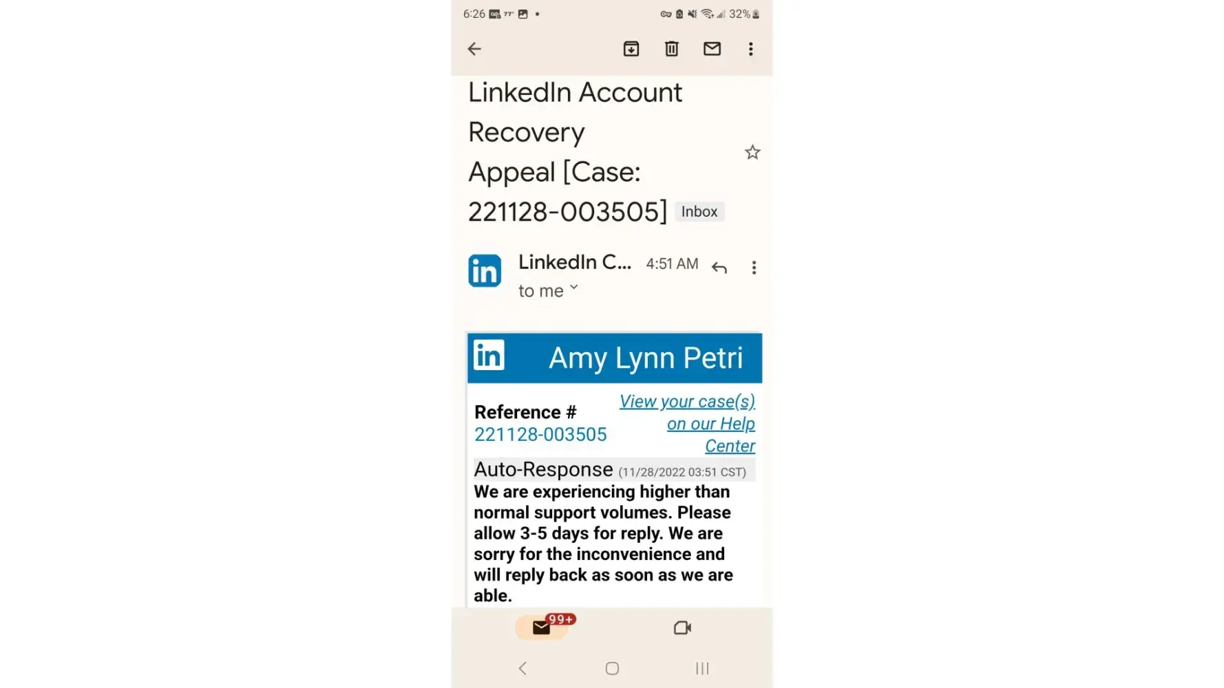 Allen K Reference # *** View your case(s) on our Help Center Auto-Response (09/25/2020 07:41 CST) ? This is a support email in response to your request submitted on LinkedIn?. LinkedIn Corporation, 1000 West Maude Avenue, Sunnyvale, CA ***... LinkedIn and the LinkedIn logo are registered trademarks of LinkedIn...