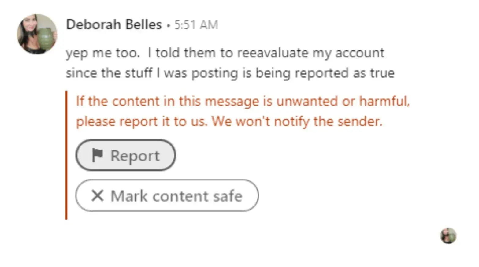 I have been censored and banned for good on Linked In for sharing opinions and videos that were not offensive but were about patriotism, media news stories relating to vaccine injuries, stories about Pfizer even though these reports were on main stream media I was not allowed to share it. Not only was some of the posts taken down, they were labeled as hateful and bullying speech. I even did a comment on a post with just a vomit emoji that LI provides on their platform. They labeled that emoji comment as hateful and bullying and removed that comment. The most troubling occurrence I found is when I was chatting on a private message in LI and the person in my conversation sent me a screen shot of our chat and LI was encouraging them to report me if they found what I was saying offensive, They do that as well to me in my open comments on post. They literally encourage folks to report others. I feel because I am conservative that I am being singled out and censored. I have the screenshot still of the conversation that I thought was private. The person had asked me how I got back on LI after being banned for a year and a half. I told that person I was let back because the posts they were claiming was disinformation was now coming out as truth. I was still not allowed to post truth even though it was being reported in the news. I feel Linked In has censored me and are politically bias and it has to stop. We cannot have a society with views on one side is allowed while the other side are silenced. I pray that we can make them accountable for these 1st amendment violations. I am currently banned for good. As a veteran I find this very troubling and disgraceful. Linked In wants to govern what info gets put out and what we share affects our lives as well as our businesses. I want my account back. I hope you can help me out.