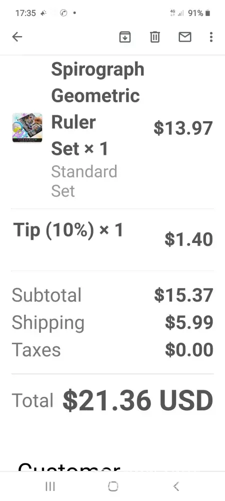 I ordered a spirograph for my grandchildren, i thought it comes in a box with a lot of different plastic circles. This is what i received for 21$ absolutely ridiculous (see photo below). This is definitely not worth 14$, plus a tip that i did not have a choice not to give. Plus shipping 6$, definitely not worth 21$. What I received is not worth more than a few dollars. This is highway robbery, taking advantage of people. Also i thought it comes from USA, but it comes from china.