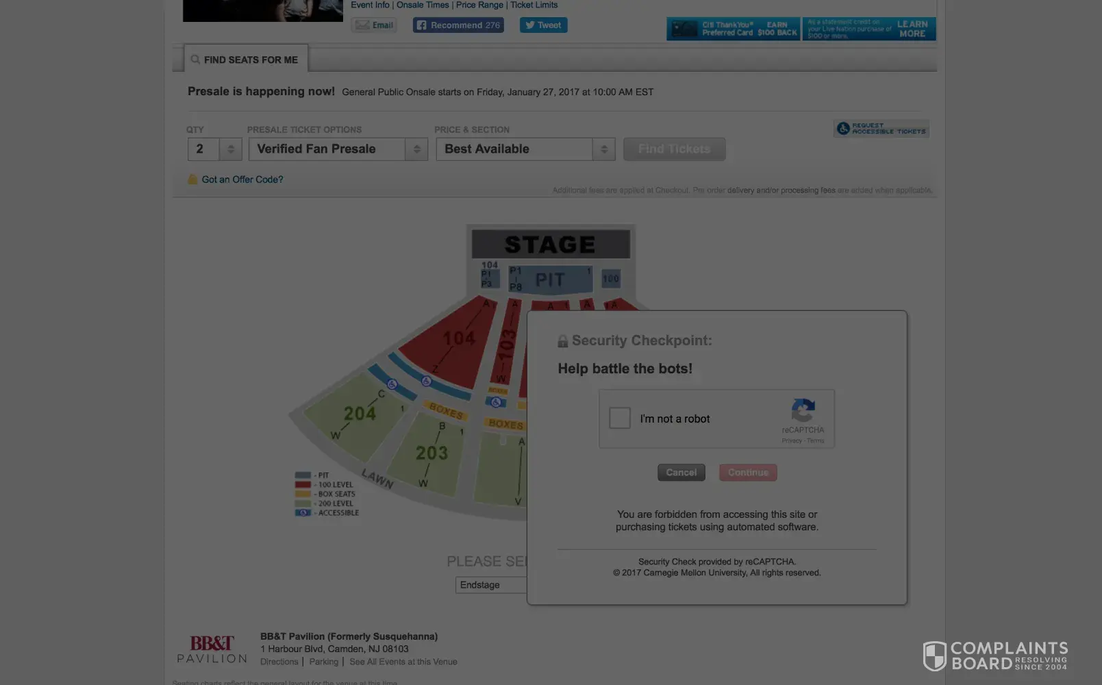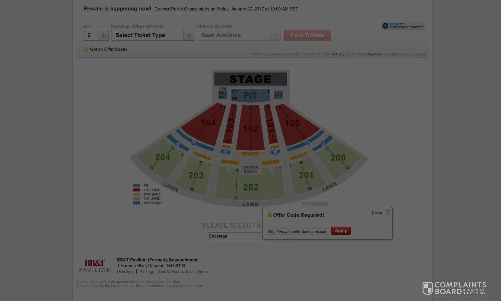 I tried buying tickets to the 5/25 Mumford & Sons concert in Camden, NJ. I signed up for the pre-sale and was given a code. I logged in at 10:00AM and overtime I tried to buy tickets with my code, the screen was blacked out. All firewall, cookies, pop-ups etc were disabled and I still could not buy the tickets. What was the point in signing up for the pre-sale when the code wouldn't work right? and now i can only get lawn seats. When I tried to call customer service (I tried multiple numbers), I couldn't get a customer service representative on the phone. And their automated phone system couldn't understand "Mumford & Sons." Horrible experience. I would not recommend this company, ever. I've attached screen shots of what happened when I tried to purchase tickets. The only way I see my experience being remedied is to be provided better tickets, but I know that will not happen.