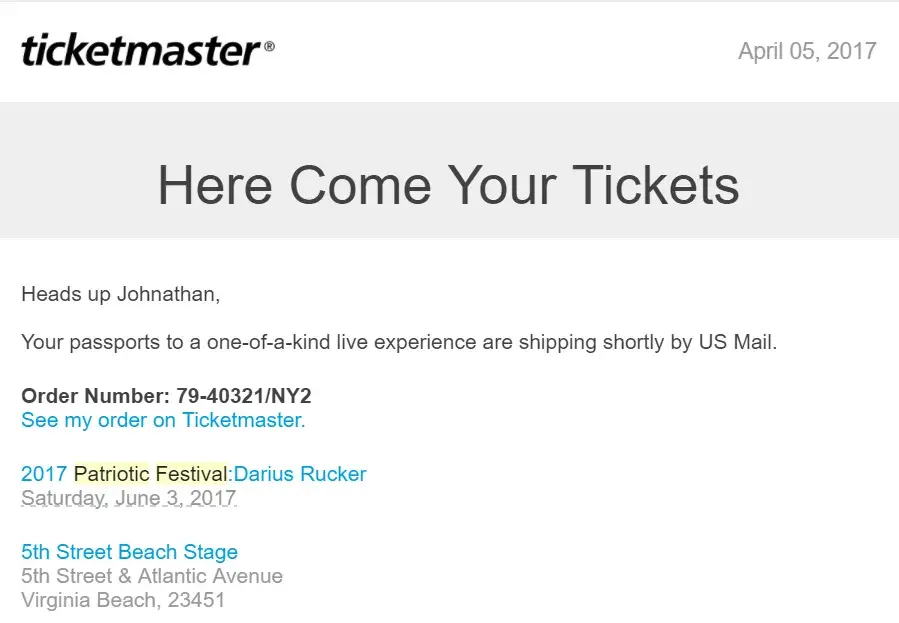 On April 2, 2017 I purchased 4 tickets to see Darius Rucker perform at Virginia Beach’s Patriotic Festival; Darius Rucker was scheduled to perform on June 3rd. Upon completing my transaction, I was notified that my tickets would be shipped to me in 10-14 days.