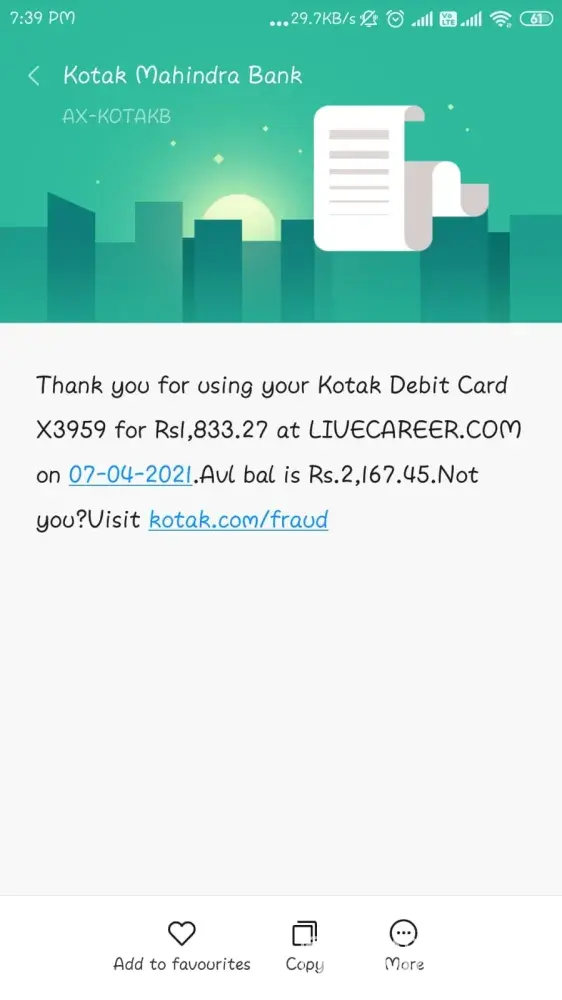 On 10th of march i was making resume on the app but without putting any details of my card 24.52$ have been debited from my account and i don't have any information of it. I had taken the subscription of it and according to their tems and conditions they will charge approx 1 $ for downloading the resume but at 2nd time my money debited from my account without downloading it I want my money back already i am suffering from money problem and i don't have my job.