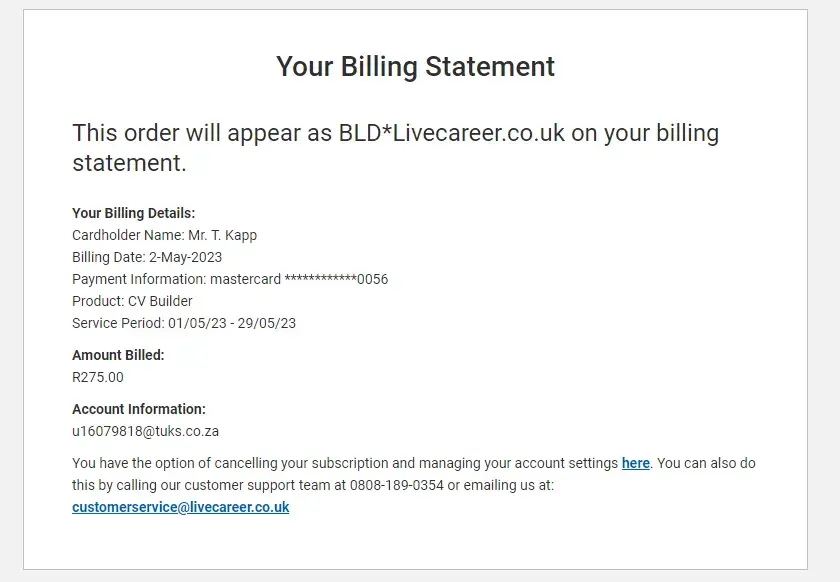 In April I used LiveCareer to create a CV. I created an account and I gave them my information to download the CV I created. In June I checked my credit card accounts and I discovered that LiveCareer charged me already 2 months for a subscription that I had never made! I contacted their customer service via email and they started asking more information on my credit card saying that they couldn’t find any subscription with my email address and account ID. Moreover, they suggested me to cancel my subscription directly from my account and, guess what?, no possibility to cancel is available! This is the 3 month in a row that I pay 24.99 euros for a service that I don’t use and I have never asked!