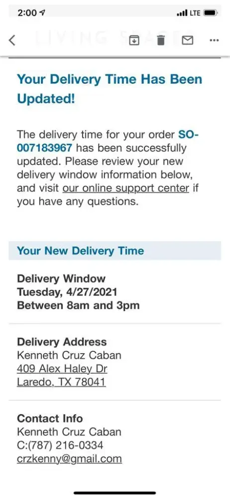 We ordered a California king mattress and a and bedframe from Living Spaces on 7/20/2022. It was scheduled to be delivered on 7/23/2022 between 8am-3pm.