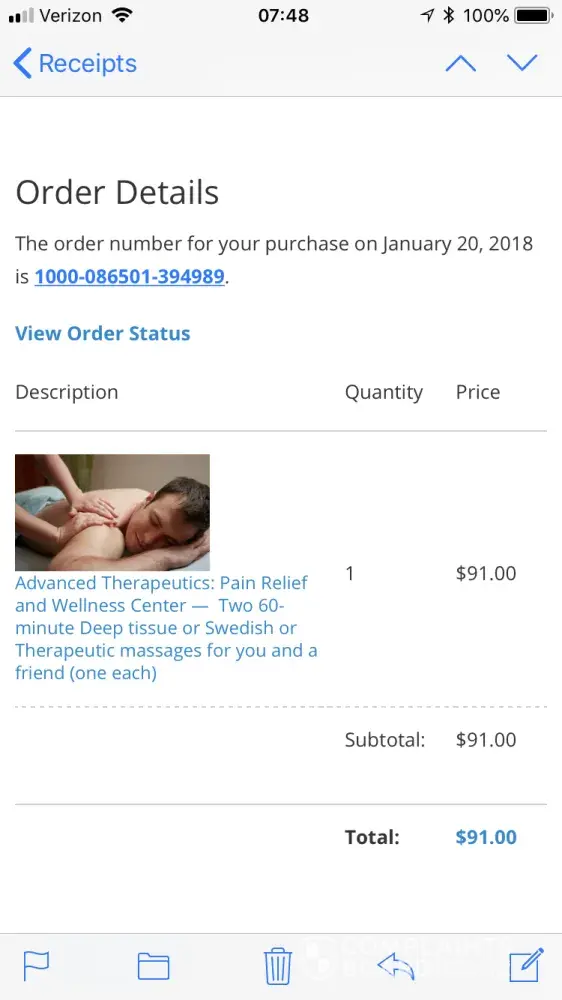 The address is 4596 Davis Ave, Conifer, CO 80433, which the post office will confirm doesn't actually exist. This same address was used for another massage scam a while back under a different company name. I bought that deal and the company was unreachable and I got my money back. Any time you see this address, it's a scam.