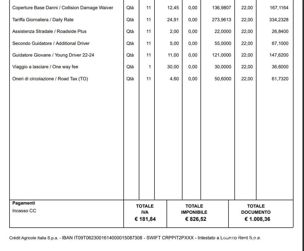 Six months after renting a car from this company, I received a message saying that due to 4 traffic violations while I had the car (which I was never informed about) the company would charge me 48 euro per violation from the credit card I had given at that time as guarantee! This is not to pay the fines, it is over and above the police fines (for violations I am not aware of and have not yet recognized) simply because traffic violations are, according to their small print, a violation of the rental contract, and they are fining me for having been fined! I have never before encountered such exploitation, which has already cost me 200 EUR for nothing! As a disabled person, I am particularly offended for having been punished in such a way for daring to rent a car to drive around Italy!