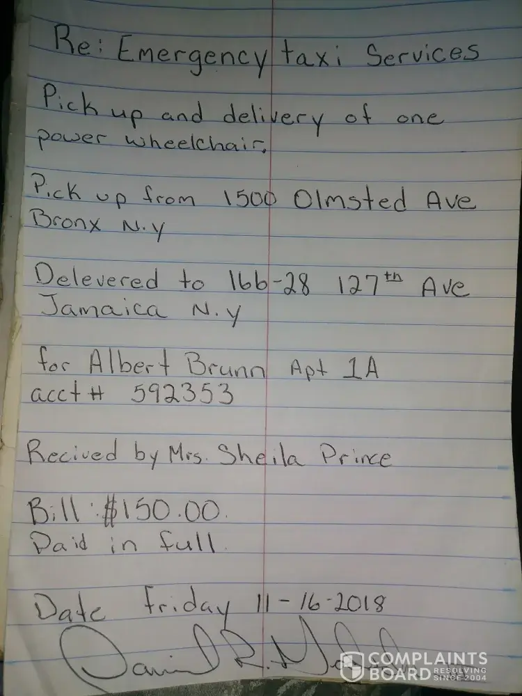 I respectfully request $150.00 Taxi Reimbursement, as soon as possible. Please make check payable to Sheila Prince. On 11/15/18 referenced client had a scheduled pick up at 1513 Olmstead Ave., Bronx, NY for 4:30PM. Due to weather conditions and traffic there was a NO SHOW. At approximately 10:30PM "EMS" was dispatched and client taken to Jacobi Hospital due to his health needs and there was no provision to take power wheelchair. With the help of 911, the neighboring grocery store provided shelter and I had to retrieve the wheelchair not after than 7:00 AM on 11/16/18. At 2:30 AM, I was able to make arrangements with Mr Gadsden to pick up the motorized Wheelchair