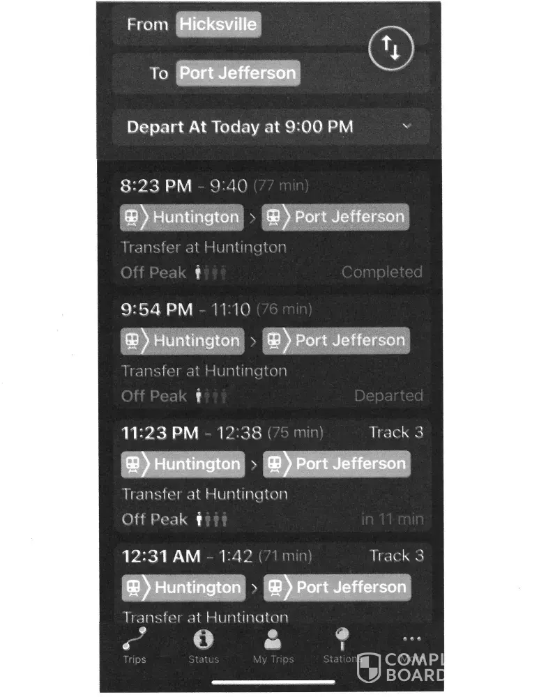 On August 8, 2021 the LIRR schedule to Huntington to Port Jefferson Station were not right. There were a early train from Huntington that's not on the app, it came about 9:25pm, I was waiting for the 9:54pm so I took it. Now I have to wait for the Port Jefferson train at Huntington. That train suppose to come at 10:22pm. So I wait at the platform so I wouldn't be late. The monitor said it was due to arrive. No train came, I wait maybe its delay because it was raining. 11:00pm no train so I take Uber because there is no other way to get to Port Jefferson to get me car.
