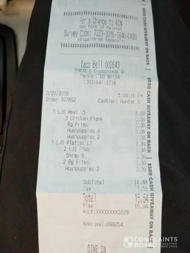 Today March 12 2018 at at 2:00 pm I went through the drive through to place my order of 8 shrimp onion rings and cole slaw which I always order from LJS the cashier Allyson k repeated order I said correct I pulled up to window and she repeated my order again 8 shrimp onion rings and coke slaw I said yes and gave her my debit card to ring me up and she gave me my order. I get home put on my lounge around clothes turn on tv sit on couch and get comfy to eat my meal and when I open the box I see all these Hushpuppies 8 to be exact 6 shrimp with no batter and cole slaw not my order so I look at my receipt and it has: