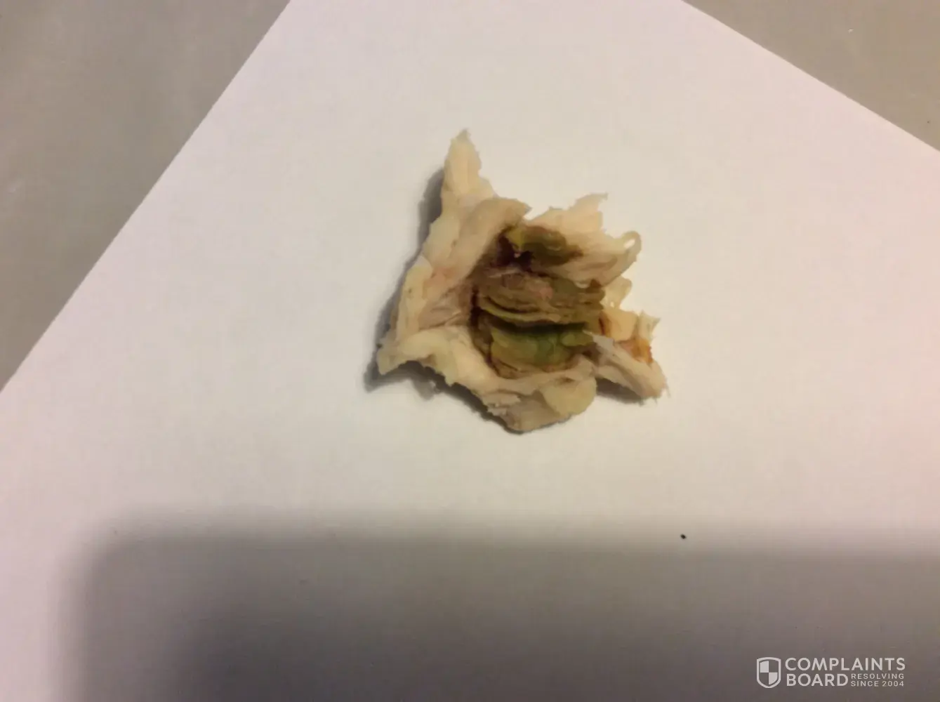 On September 28, I bought 2 chicken meals from Long John Silvers, Hermitage, PA. I get food from there at least twice a month. This is the first time I have an issue. On 28th I put the leftover pieces in the freezer. Today when I was eating them, I saw a dark streak in one of the pieces. I cut it open lengthwise to see what it is. I saw some disgusting thing inside. I don't know what it is. It is dark green with layers and about the size of a nickel. I took pictures. I am posting them here.