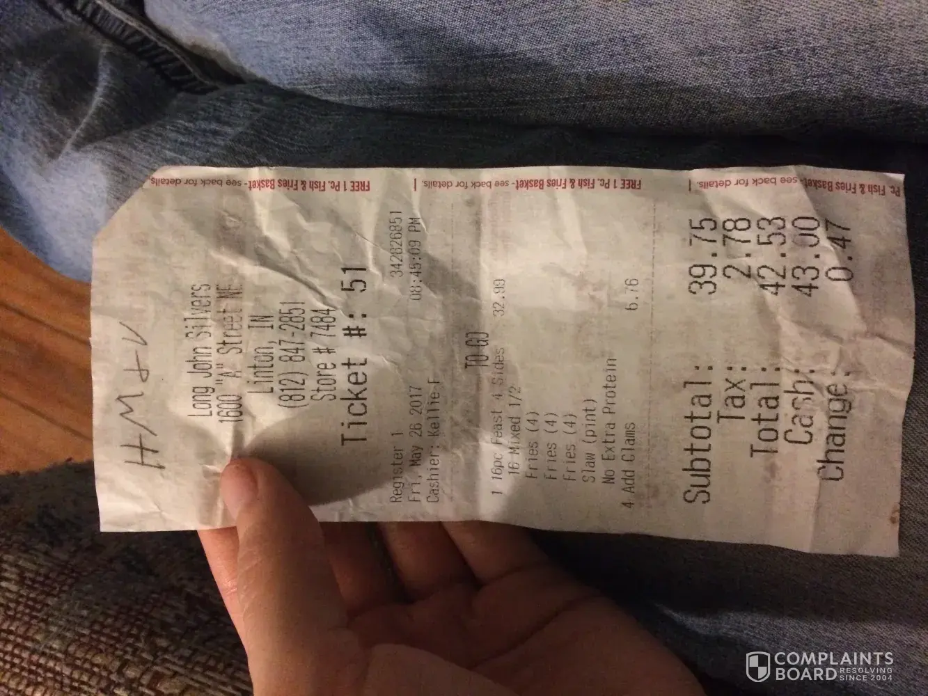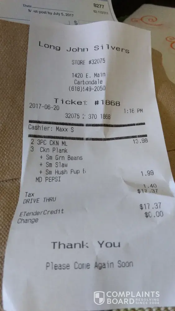 I ordered two 2-piece chicken/ 2 boxes of crumbs + 2 extra chicken. This always comes with fries and a hush puppy. My order consisted of one box with 6 pieces of chicken that was soggy and not at all like long john silvers chicken always has been. There were no fries or anything else. Just chicken and crumbs.