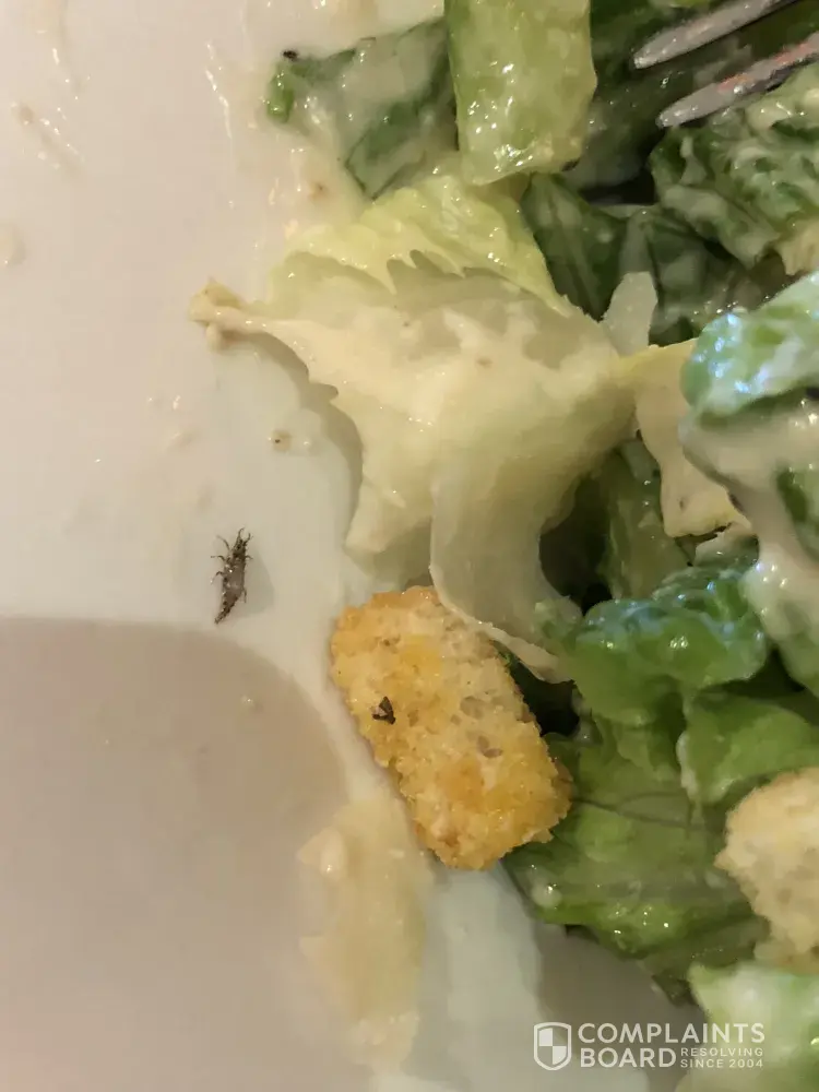 Today we went to have lunch at the Longhorn location in Homestead, Florida and there was a bug in the Caesar salad. The bug was alive and moving. Immediately we called the waitress and decided to leave. What should have been an enjoyable meal became a nightmare because it caused me to regurgitate. As a consumer, I trust that a restaurant will provide excellent service, a clean environment, and good tasting food. Today I got none of that. Please see attached picture.